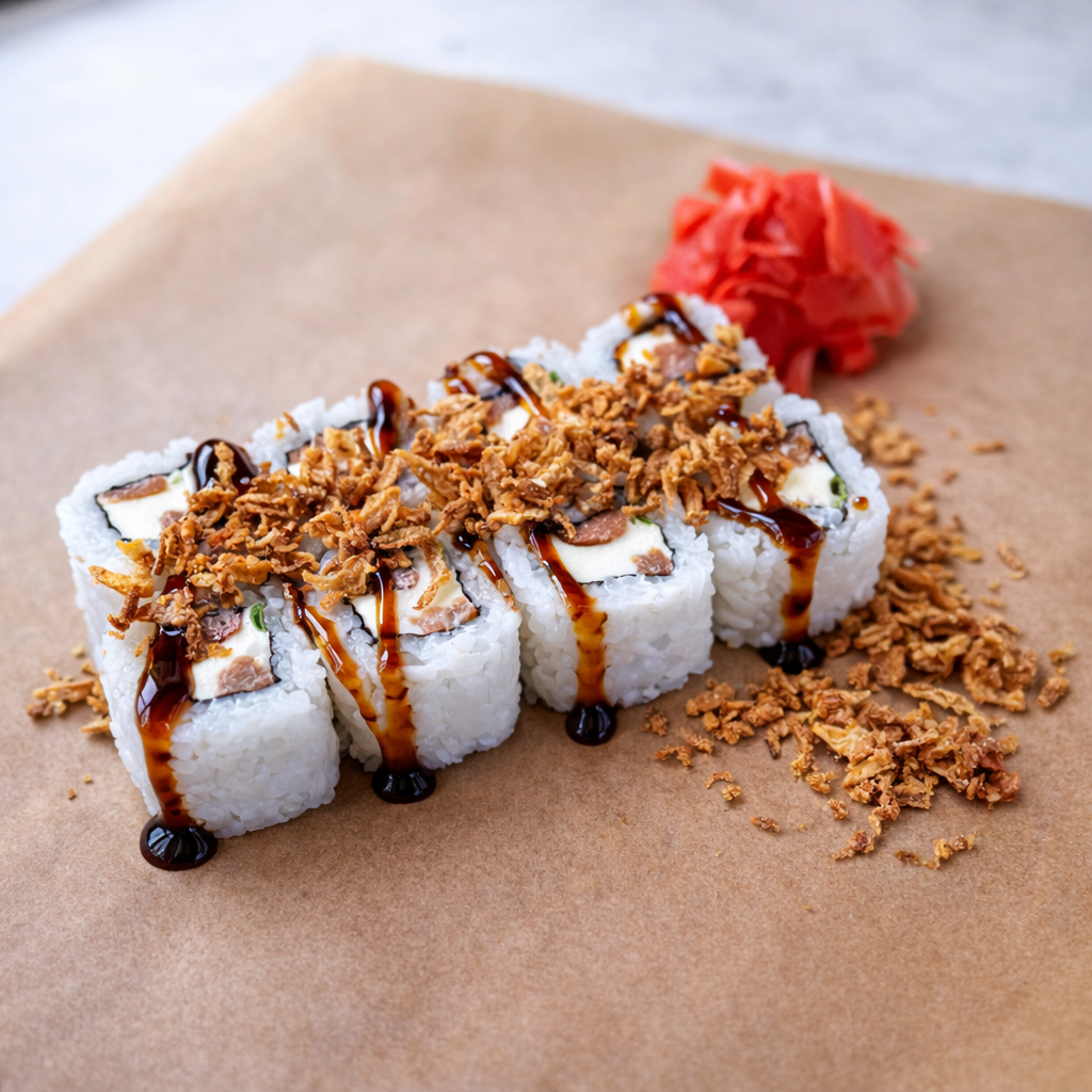 Основа из риса и нори, начинка — нежная копчёная горбуша, творожный сыр и свежий зелёный лук. Сервируется хрустящим жареным луком, соусом унаги и имбирём. Срок годности: 72 часа Масса: 280 грамм